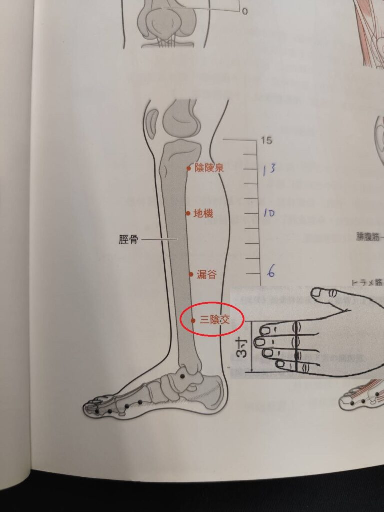 内くるぶしのてっぺん(一番高いところ)に小指の端、人差し指の端に三陰交があります。
