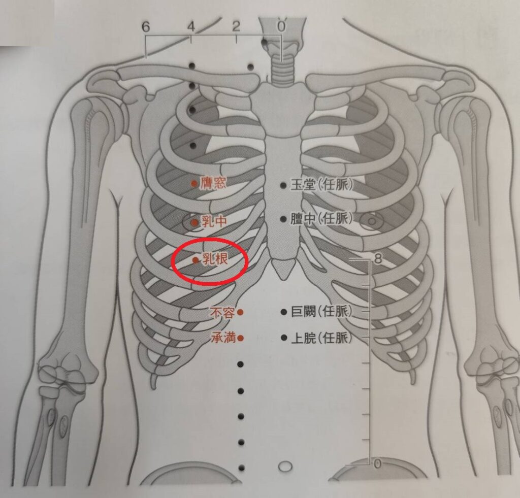 乳首の真下、乳房の付け根あたり(第5肋間)に位置します。